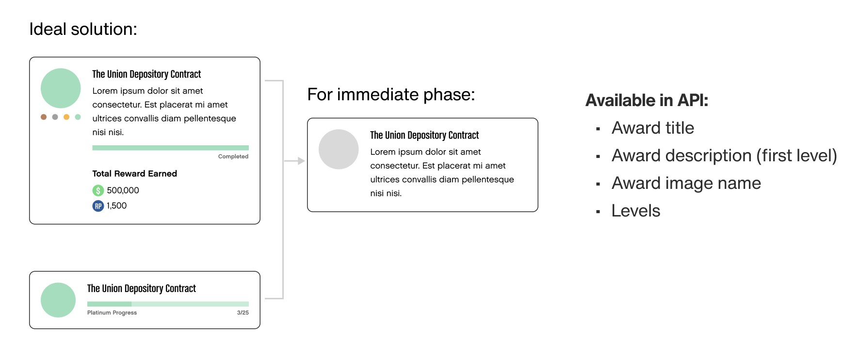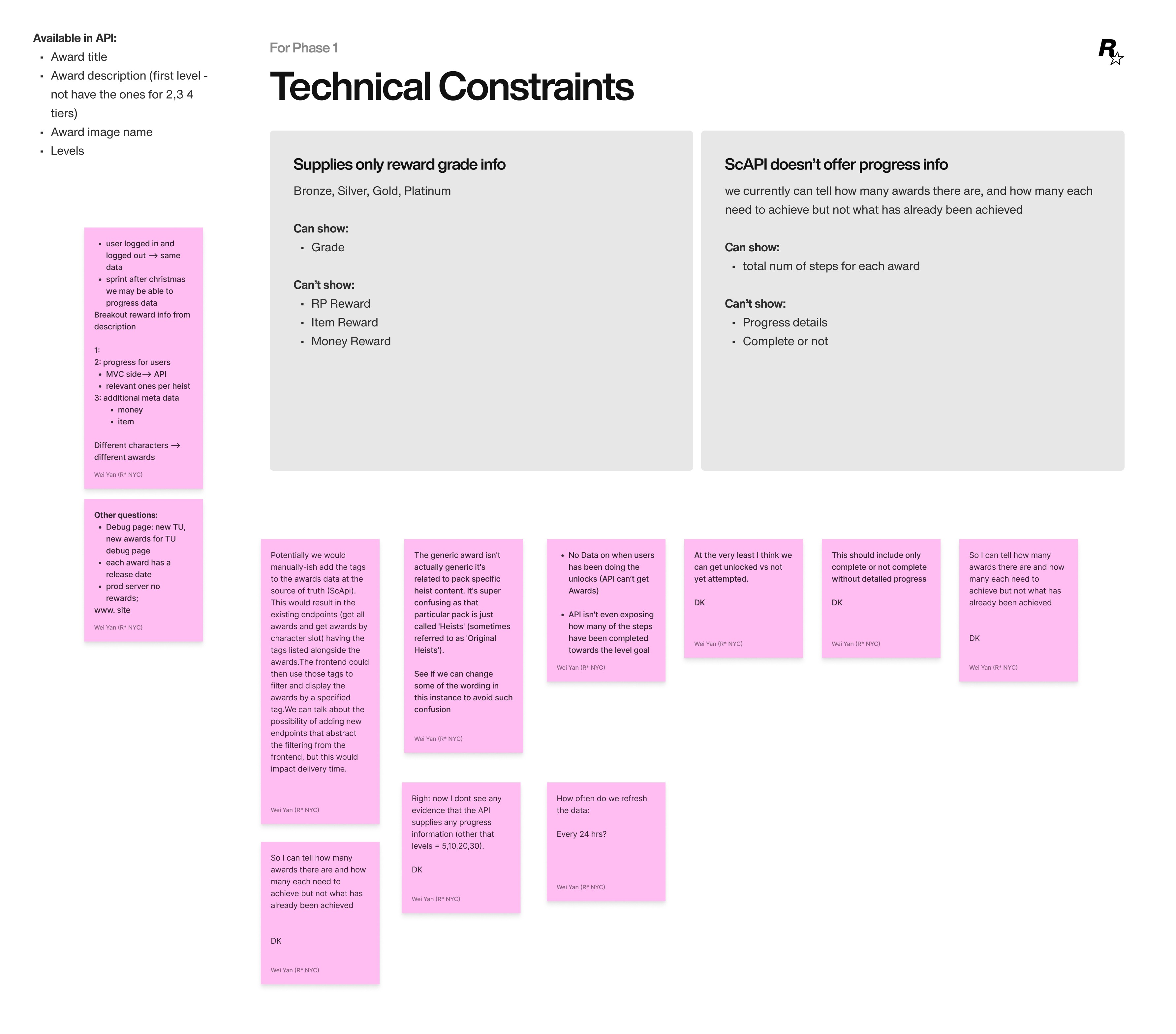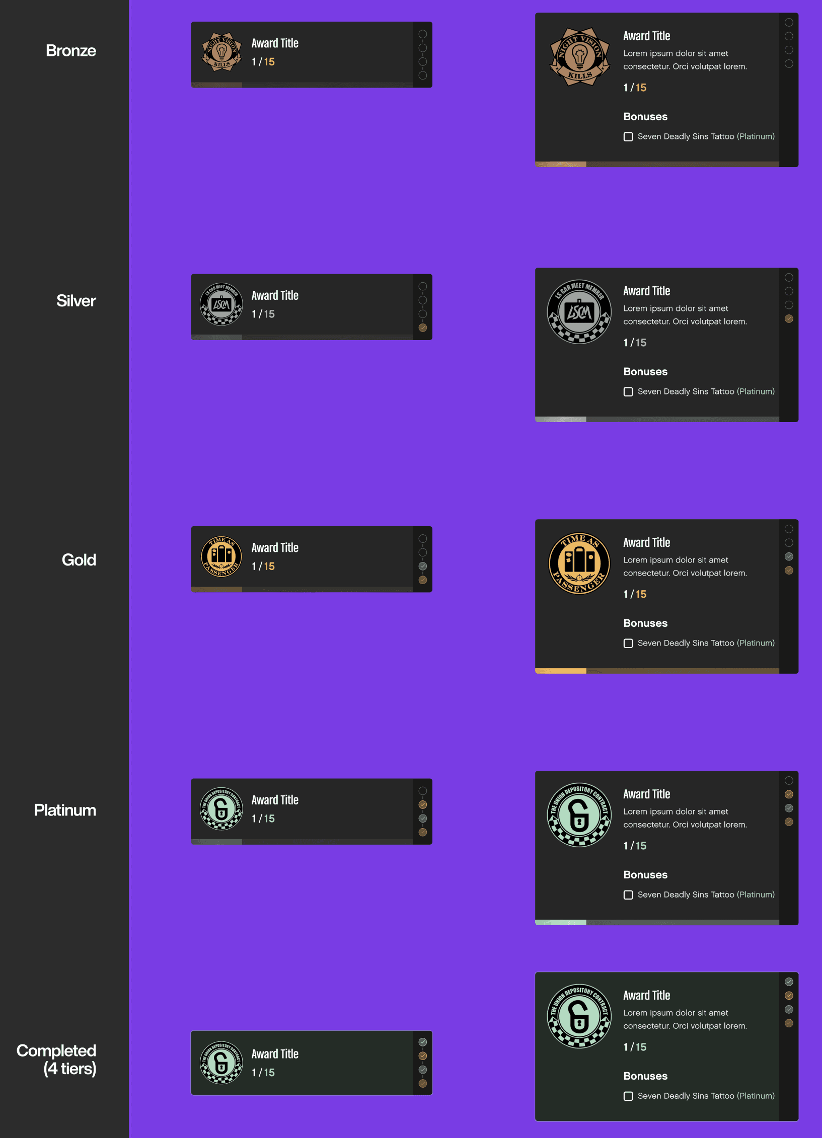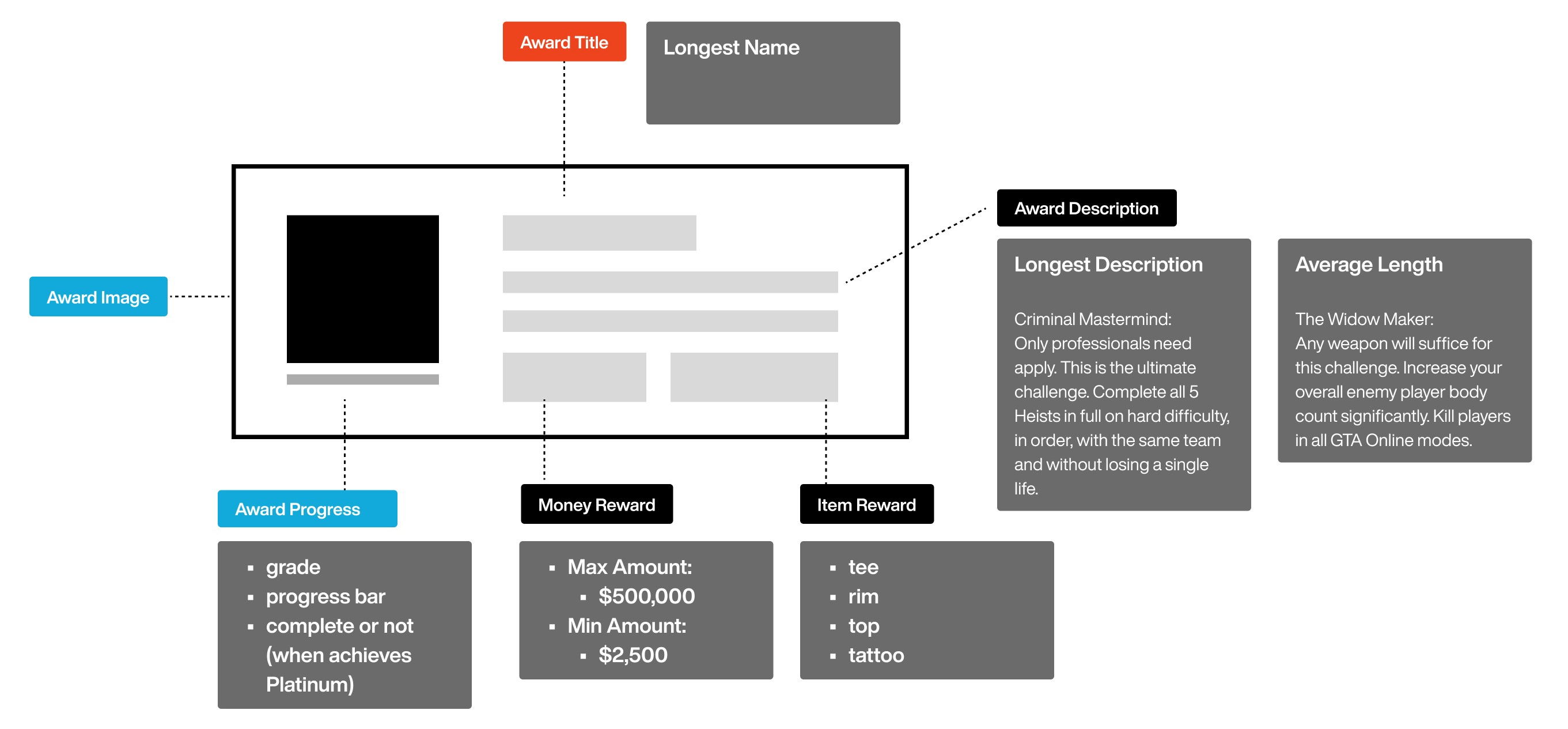 Components on Rockstar websites need to work across many breakpoints and layouts. We were moving away from static pages toward flexible, living components. When I designed the GTA Online Awards progression experience, there were more than 250 awards, each with multiple states. I started by auditing all awards and aligning on the anatomy of an “award” component.